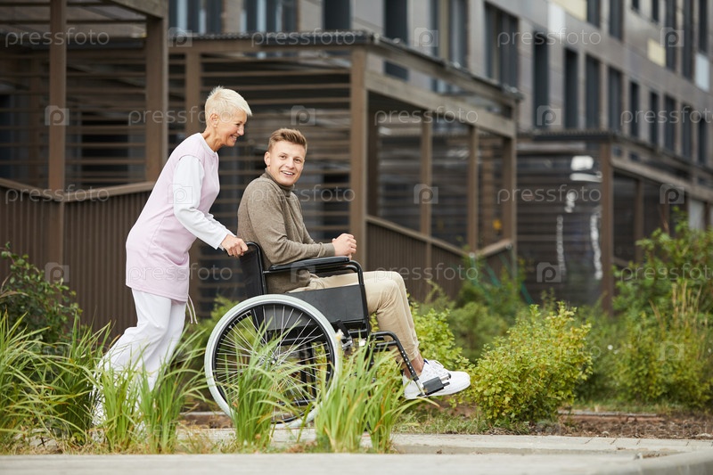 Позитивная энергичная леди в медицинской форме толкает инвалидное кресло с мальчиком, пока они гуляют по городу