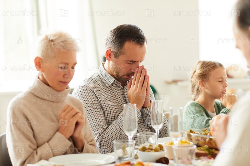 Семья молится за обеденным столом