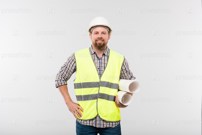 Молодой веселый инженер или мастер в защитном шлеме и рабочей одежде