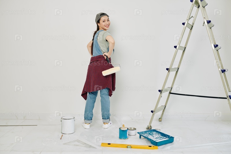 Красивая женщина рисует стены