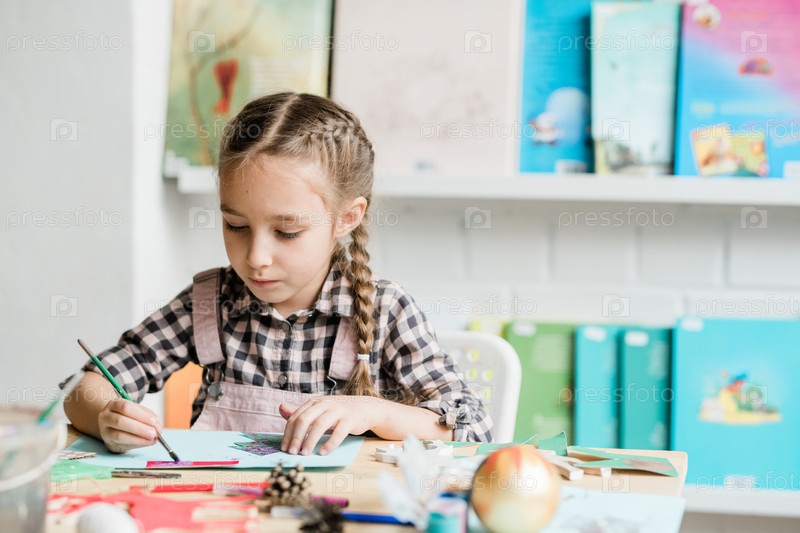 Творческая школьница с кистью сидит за столом и рисует рождественскую картину