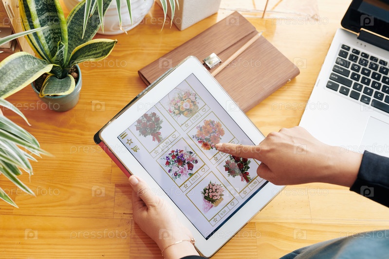 Женщина, выбирающая букет онлайн
