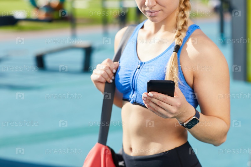Близкий план спортивной девушки с сумкой, стоящей на спортивном поле и использующей приложение для тренировок на смартфоне