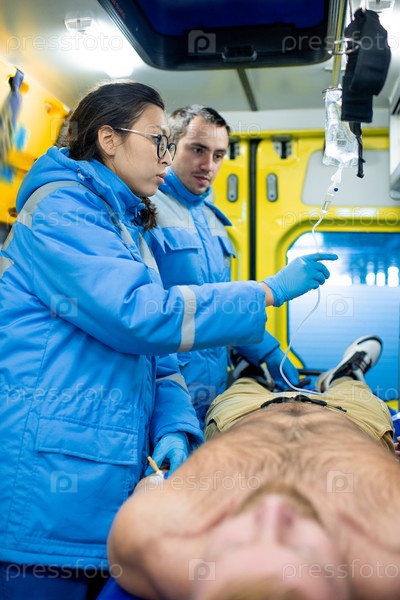Два молодых парамедика готовят капельницу для больного мужчины внутри машины скорой помощи