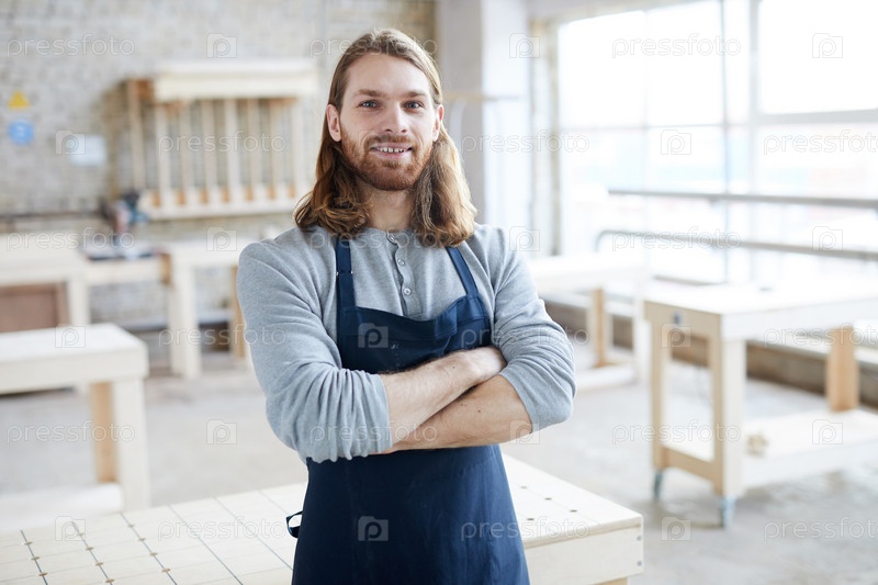 Улыбающийся довольный красивый молодой бородатый плотник с длинными волосами, носящий фартук, стоявший в современной мастерской и перекрестивший руки на груди, глядя в камеру