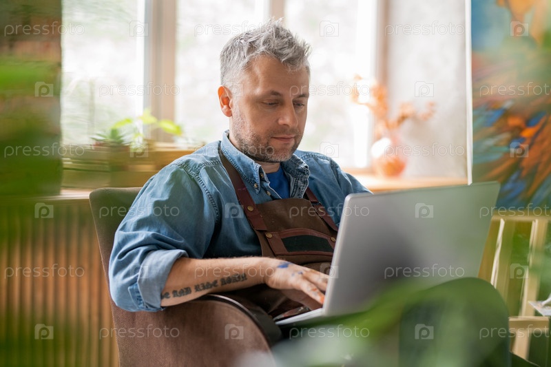 Серьезный художник в рабочей одежде сидит в студии перед дисплеем ноутбука