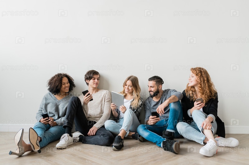Счастливые молодые межкультурные друзья с гаджетами смотрят смешное видео