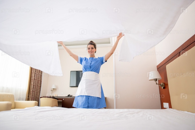 Красивая молодая горничная в униформе, растягивающая белое чистое полотно над кроватью