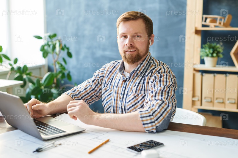 Контент красивый молодой бородатый инженер в беспроводных наушниках сидит за столом и смотрит на камеру, заполняя онлайн-документ на ноутбуке