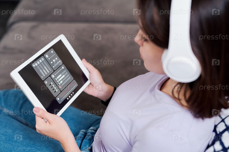 Современная молодая женщина с помощью умного приложения дистанционного управления