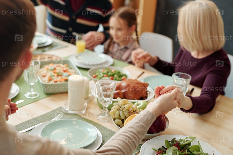 Руки семьи держатся друг за друга над подаваемым праздничным столом во время молитвы