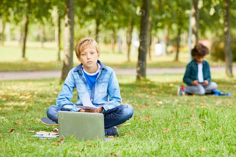 Мальчик, изучающий онлайн на открытом воздухе