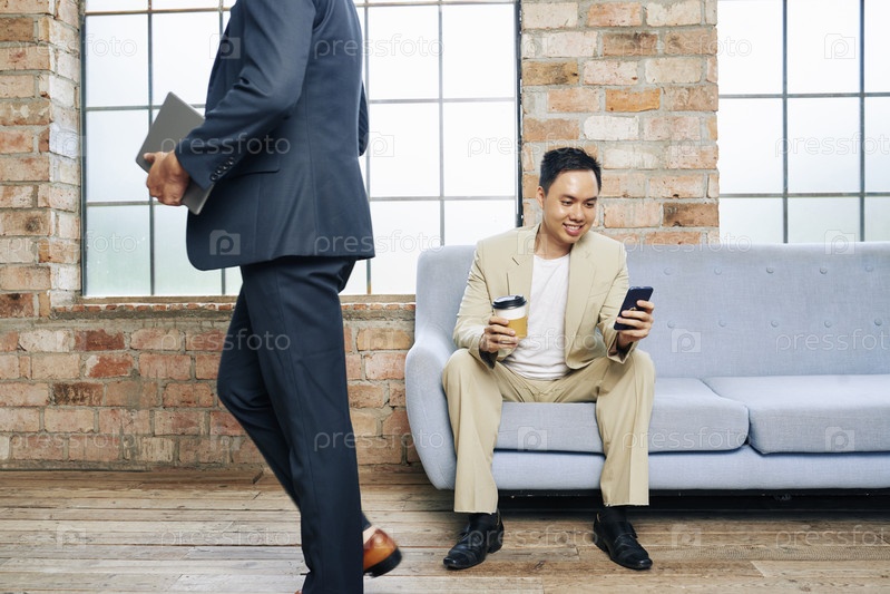 Улыбающийся бизнесмен с текстовыми сообщениями