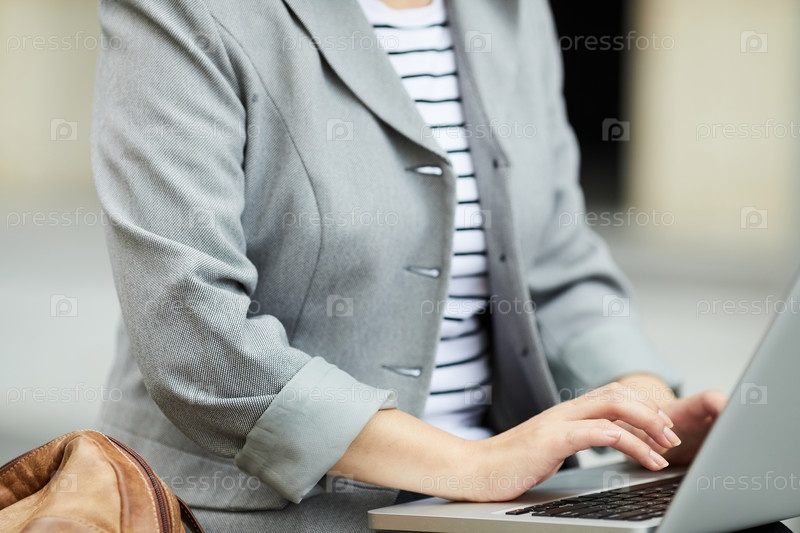 Молодая деловая женщина, использующая ноутбук на открытом воздухе Closeup