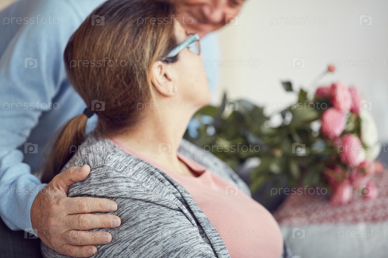 Близкий план старшего мужчины, касающегося плеча жены и получающего подарок на День святого Валентина