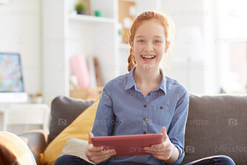 Счастливая девочка-подросток, держащая планшет
