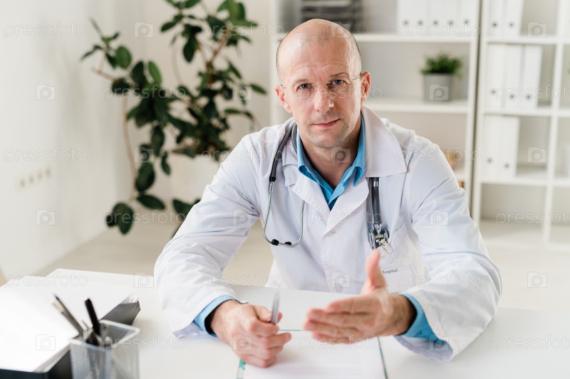 Уверенный практик со стетоскопом и ручкой, дающий вам медицинскую консультацию