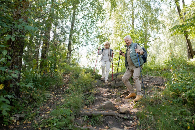 Зрелый мужчина и женщина с тростниковыми палками движутся вниз по холму в лесу