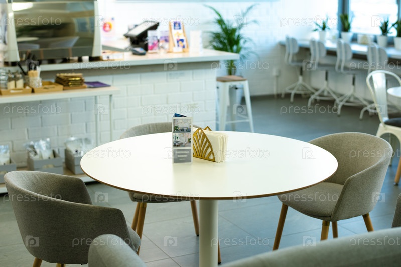 Белый круглый стол с листовкой и бумажными салфетками, окруженный креслами
