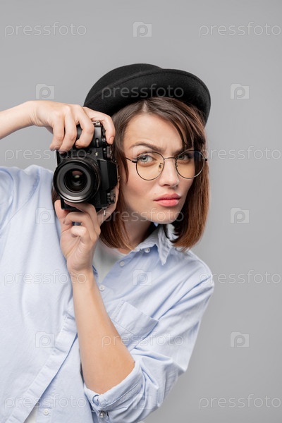 Молодая серьёзная женщина-фотограф с камерой, сосредоточенная на съемке