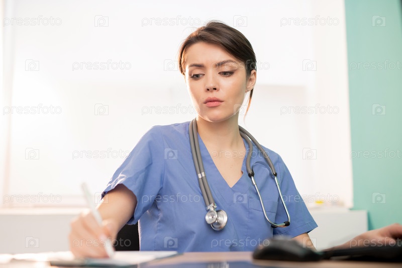 Молодой серьезный врач или стажер в синей форме делает рабочие заметки по месту работы