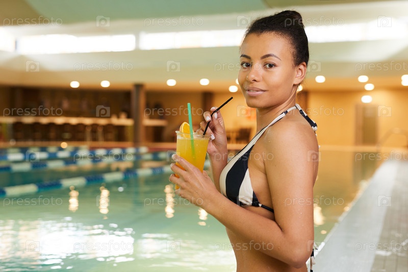 Красивая женщина наслаждается коктейлями в бассейне