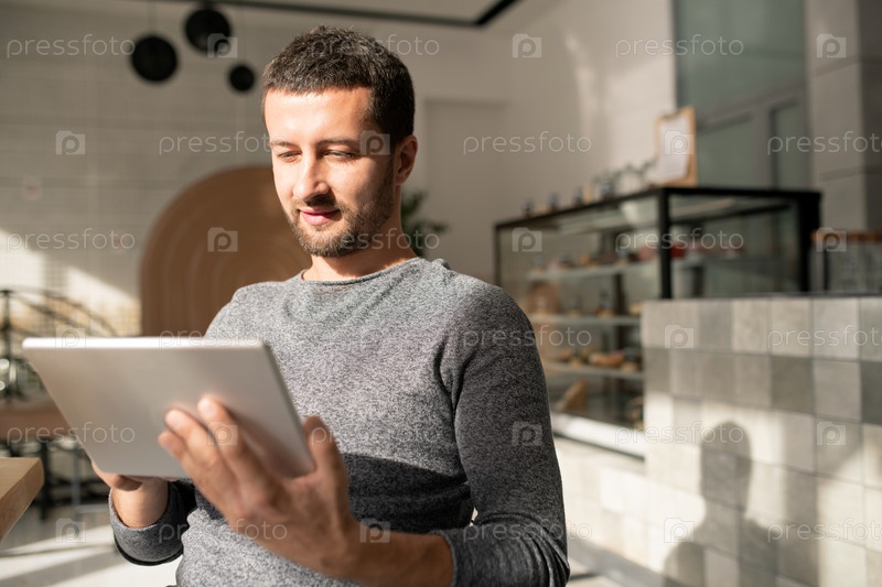 Счастливый молодой человек с мобильным гаджетом, прокручивающим онлайн-материалы
