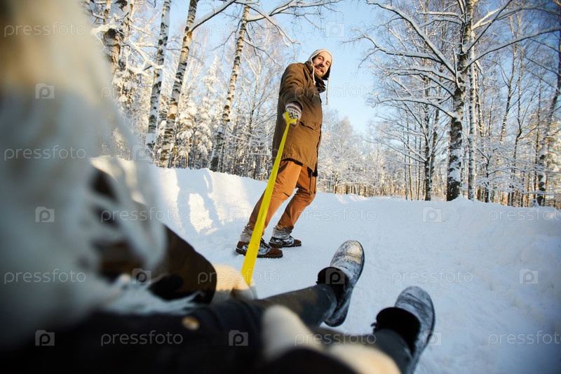 Зрелый мужчина тянет сани зрелые