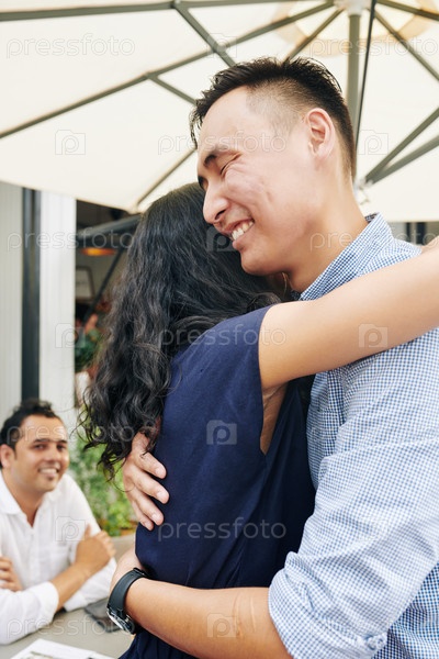 Веселый мужчина обнимает подругу