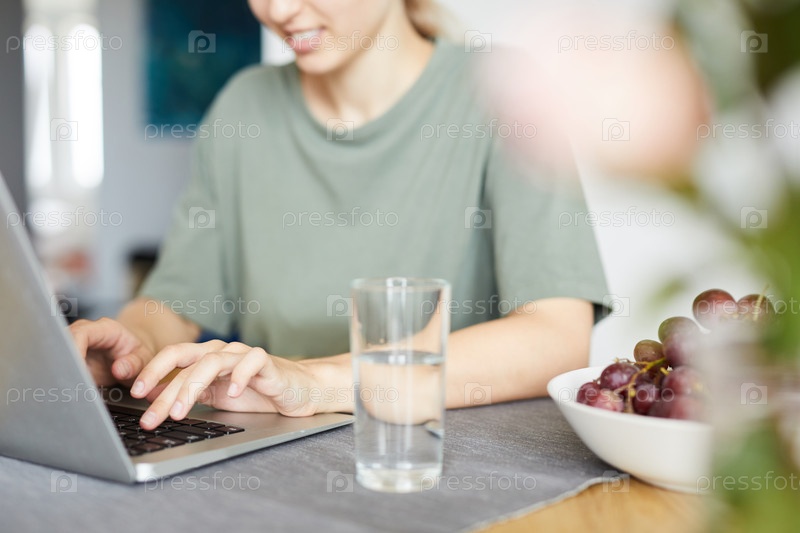 Молодая женщина сидит перед ноутбуком у кухонного стола дома