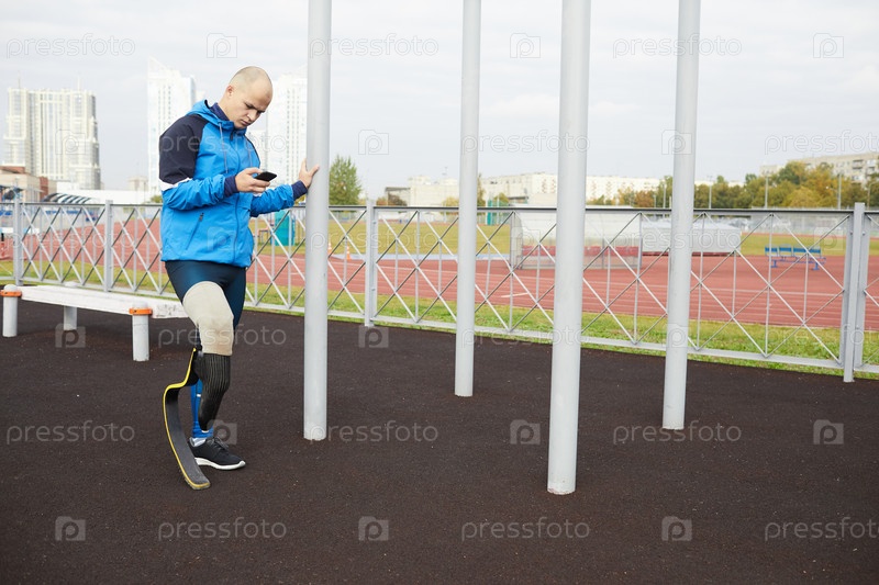 Серьезный одноногий молодой спортсмен с лысой головой, имеющий бегущее лезвие, стоит на спортивной площадке и проверяет телефон