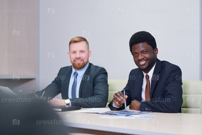 Два межкультурных бизнесмена в формальной одежде взаимодействуют с партнером
