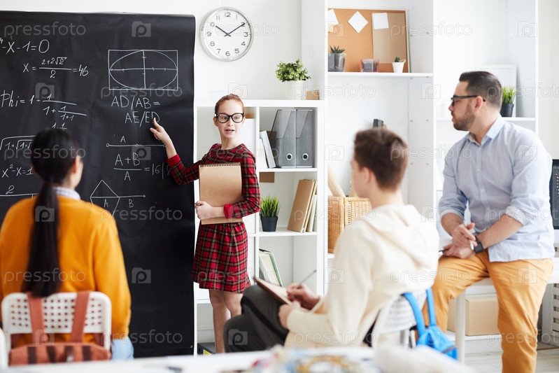 Уверенная в себе умная девушка с высоким уровнем интеллекта стоит у доски и указывает на формулу, преподавая студентам в университете