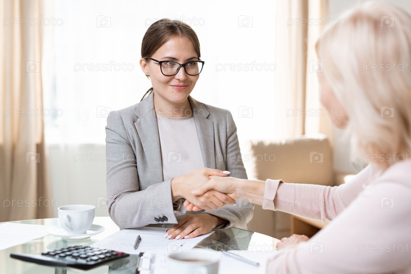 Молодой агент в формальной одежде смотрит на зрелого клиента, обнимая ее руку