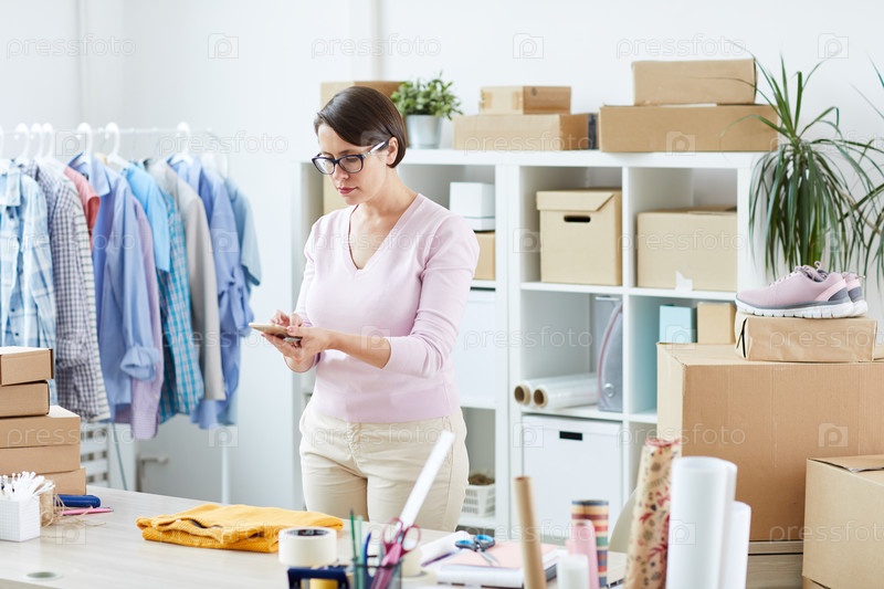 Менеджер онлайн-магазина повседневной одежды фотографирует сложенный желтый пуловер
