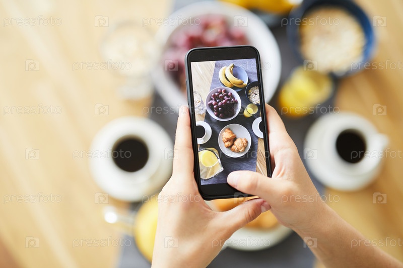 Свежая еда и закуска подаются на завтрак на сенсорном экране смартфона