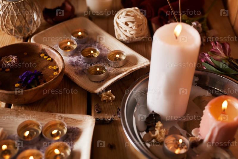 Близкий план горящих ароматических свечей разных размеров и цветов, рассеянных на столе в спа-салоне