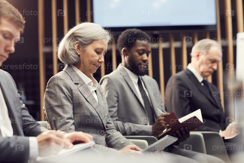 Группа серьезных мультиэтнических бизнесменов, сидящих в очереди и делающих заметки во время обобщения информации на конференции