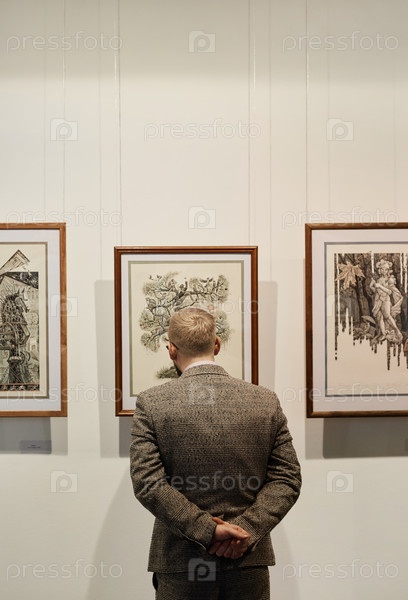 Мужчина смотрит на картины в галерее