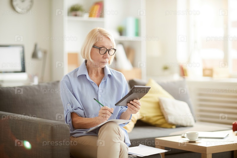 Старшая женщина, рассчитывающая бюджет