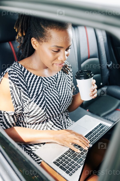 Деловая женщина, работающая с ноутбуком в машине