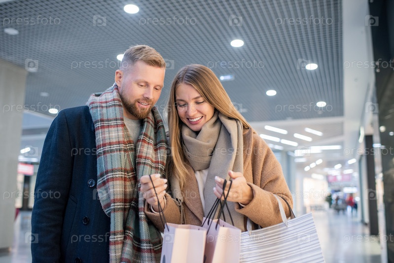 Молодая улыбающаяся женщина показывает мужу, что она купила на сезонных распродаж