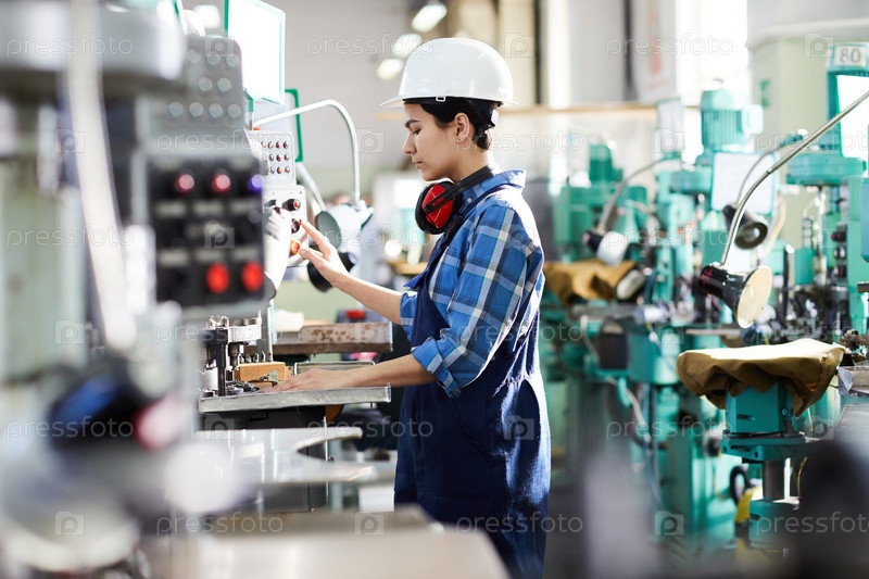 Серьезная молодая женщина-инженер в Hardhat сосредоточилась на производственном процессе, нажимая кнопку на панели управления промышленной машины