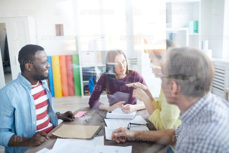 Группа многонациональных коллег, сидящих за столом позади стекла и обменивающихся идеями и стратегиями на встрече