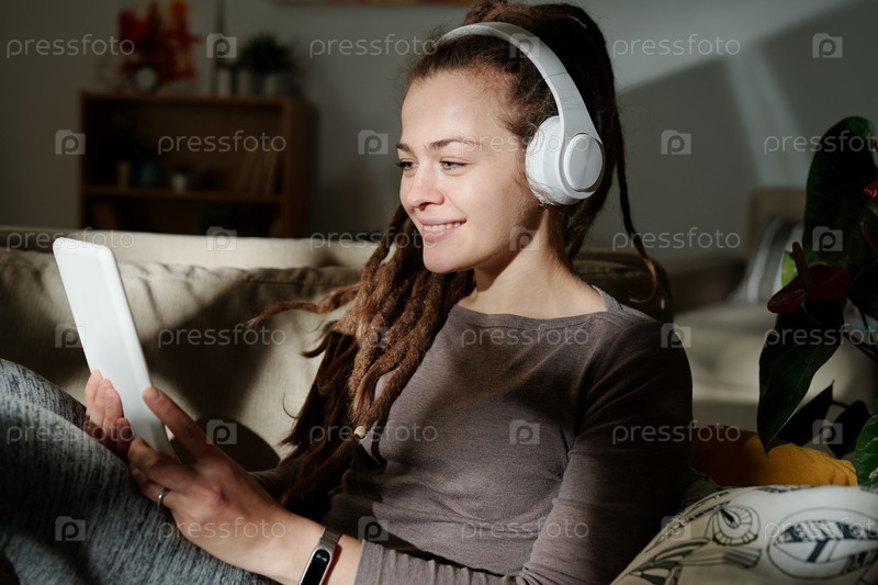 Девушка с наушниками, держащая перед собой планшет во время просмотра фильма