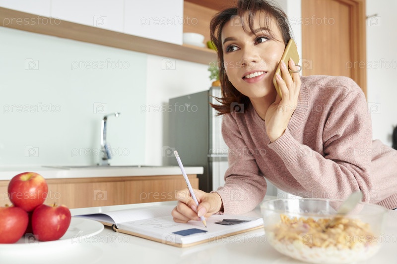 Женщина разговаривает по телефону во время завтрака