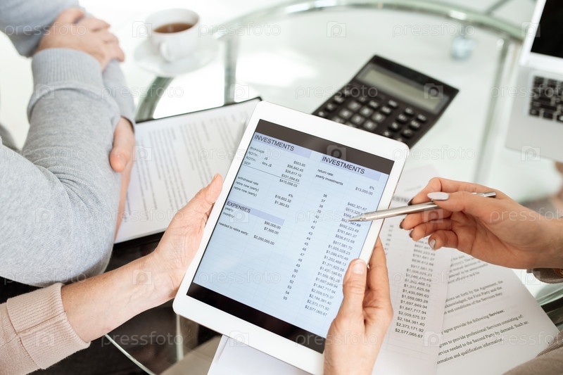 Группа людей обсуждает электронный финансовый документ на дисплее планшета