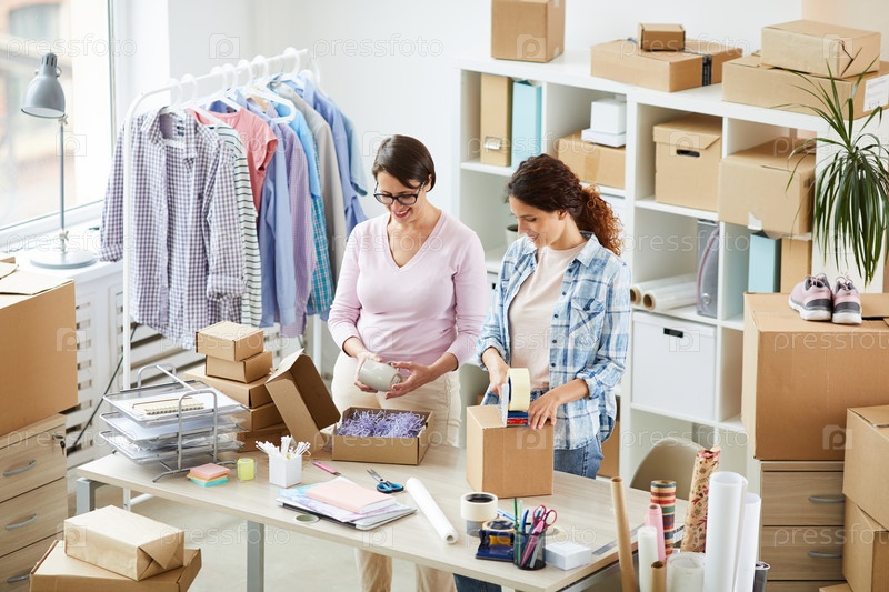 Две современные женщины упаковывают онлайн-заказы клиентов в офисе