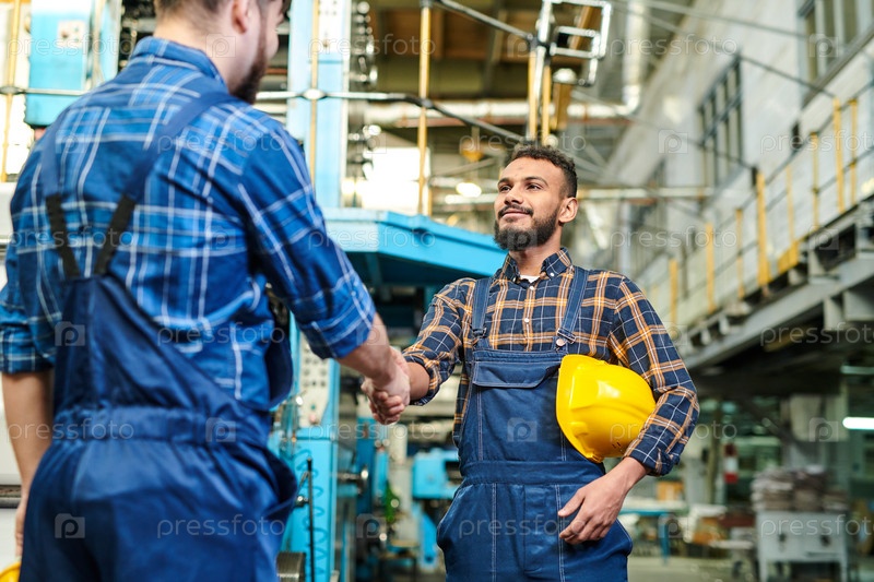 Успешные работники производства в форме рукопожатия, поздравляя друг друга с выполненной работой, работают на фабрике