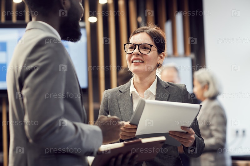 Веселая привлекательная молодая бизнесвумен в очках, держащая клипборд и разговаривая с коллегой на форуме